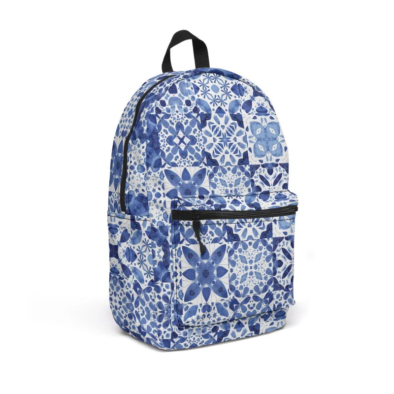 Discover the perfect balance of style and function with this blue geometric print backpack. Crafted from durable fabric, it features a spacious main compartment with a padded laptop sleeve to keep your device protected, a handy front zipper pocket for small essentials, and a side mesh holder ideal for a bottle or umbrella. The soft padded shoulder straps and cushioned back support provide extra comfort throughout your day.